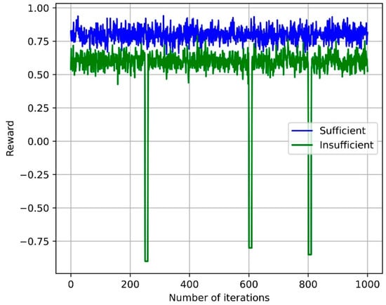 - Reward Function: Because the goal of the algorithm is to maximize the long-term weighted average of the task-completion rate, a penalty-based reward function was designed. If the task-completion processing rate falls below a certain threshold, a penalty is applied to reduce the reward. This reward structure encourages higher performance by penalizing agents that lead to poor performance, thereby driving them to achieve better results. The reward function is defined aswhere, is a coefficient that determines the reward slope based on the task-completion rate and sets the offset value of the reward. Additionally, is the threshold of the task-completion rate and is the penalty applied when the performance falls below the threshold.