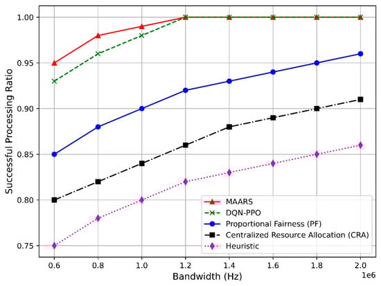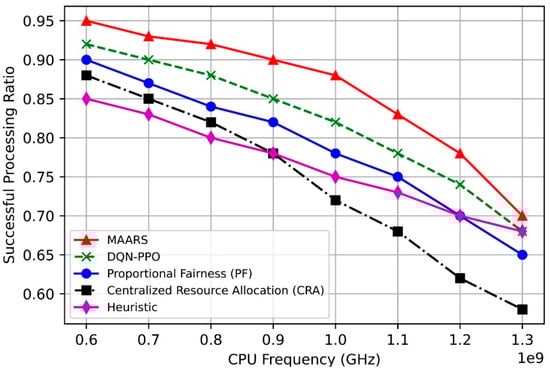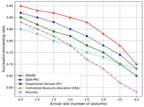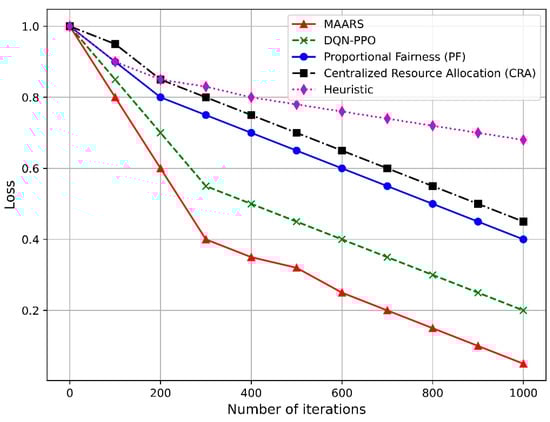 Figure 11 illustrates the loss ratios as the number of iterations increases for various resource-allocation algorithms, including MAARS, DQN–PPO, PF, CRA, and heuristic-based. As the number of iterations increases, the loss ratio of MAARS decreases; thus, it outperforms all other algorithms in terms of convergence speed and efficiency. DQN–PPO also demonstrates significant loss reduction, but lags behind MAARS. PF and CRA show more moderate loss reduction, whereas the heuristic algorithm exhibits the highest loss ratio. MAARS achieves superior performance owing to its collaborative and adaptive resource management, which ensures efficient task processing and resource allocation across network slices. By contrast, DQN–PPO, although effective, allocates resources independently for each slice, which limits its overall optimization performance. Furthermore, PF focuses on fairness, which constrains its ability to optimize performance, while CRA struggles to adapt quickly to dynamic network conditions owing to its centralized approach. Finally, the heuristic-based algorithm relies on fixed rules and, therefore, cannot effectively adapt to the complexity of real-time network demands. Consequently, MAARS consistently demonstrated superior loss-reduction performance over time than the other algorithms.