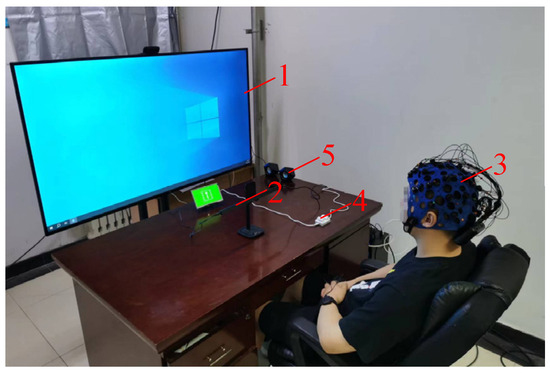 Diagram of the simulated experimental setup. 1—Driving video display screen; 2—eye tracker; 3—EEG cap; 4—button; 5—speaker.