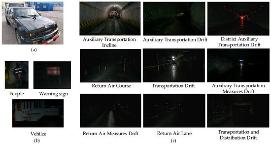 The experiment employed videos of mine transport vehicle operations and driving task scenarios as stimulus materials. The mine transport vehicle driving videos were recorded with a 4 K resolution camera in an underground coal mine, capturing both the visual and ambient environmental sounds during driving. The experimental vehicle is shown in Figure 2a. The types of obstacles featured include personnel, warning signs, and other vehicles, as depicted in Figure 2b. The driving videos encompassed various tunnel types, such as auxiliary transportation inclines, auxiliary transportation drifts, district auxiliary transportation drifts, return air courses, transportation drifts, auxiliary transportation measure drifts, return air measure drifts, return air lanes, and transportation measure drifts, as illustrated in Figure 2c. Tunnel scenes included straight roads, curved roads, right-angle bends, intersections, slopes, and specific conditions such as water spraying, dust, and low-light environments. A total of 36 video clips were collected, with each clip lasting between 90 and 180 s. The total duration of all videos was 1 h and 28 min.