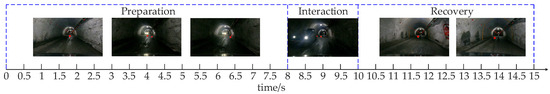 From 1 to 8 s, the vehicle decelerates from the center of the tunnel towards the right edge in preparation for the interaction. Between 8 and 10 s, the vehicle engages in the interaction at a low speed. From 10 to 15 s, the vehicle returns to the center of the tunnel and resumes normal driving.