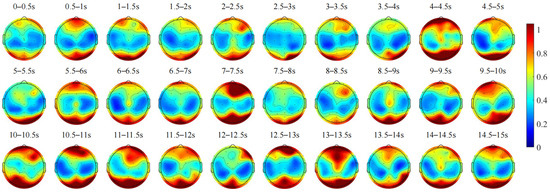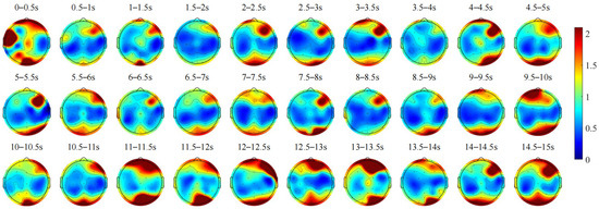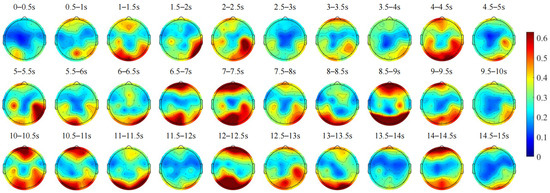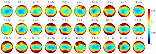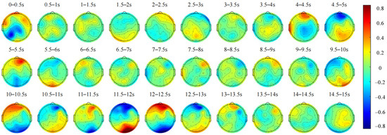 The average spatial topographic maps of the EEG signals from all subjects and their changes over time are shown in Figure 5, with a 0.5 s time window representing the distribution of the average amplitude on the scalp.