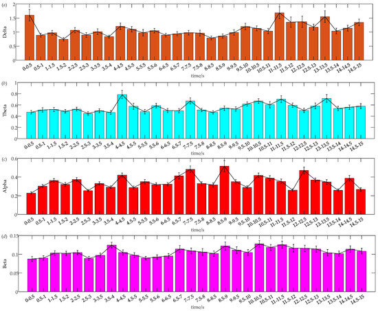 Figure 6 presents a bar chart showing the average differences in EEG power across four frequency bands for all subjects at different time intervals, with the data organized according to the interaction process timeline. Delta waves, the slowest brainwaves, typically occur during deep sleep and are associated with profound relaxation, recovery, and increased mental effort [23]. Figure 6a illustrates that Delta-band energy begins at a relatively high level. During the preparation and interaction phases of dynamic vehicle interaction, Delta-band energy initially declines, then rises prominently around 11.5 s, and maintains a high level thereafter. Specifically, in the preparation phase, Delta-band energy decreases within the first 2 s, slightly increases over the next 1.5 s, then declines again from 3.5 to 4 s. After 4 s, Delta-band energy continues to decrease until a slight rise at 6 s, followed by stabilization until 8 s. In the interaction phase, Delta-band energy shows a steady increase from 8 to 10 s. During the recovery phase, Delta-band energy decreases from 10 to 11 s, peaks sharply between 11 and 11.5 s, and then declines over the next 1.5 s. From 13 s onward, Delta-band energy first increases, then fluctuates, culminating in a continuous rise in the final second.