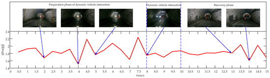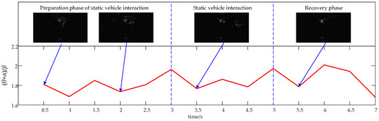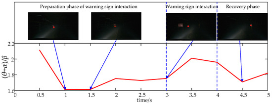 Figure 12 illustrates that the average relative power combination value of (θ + α)/β during the static vehicle interaction process varies from 1.47 to 2.23. In the preparatory phase, the driver first observes a parked vehicle on the left edge of the tunnel, leading to increased alertness. Focus shifts primarily to the right side of the parked vehicle. As the vehicle moves closer and it becomes apparent that the parked car will not obstruct normal driving, alertness decreases. During the static vehicle interaction phase, alertness rises again as the vehicle engages with the parked car, then tapers off as the interaction ends. In the recovery phase, alertness initially increases in preparation for subsequent driving tasks, then decreases as normal driving conditions resume but remains at a level adequate for ongoing tasks.