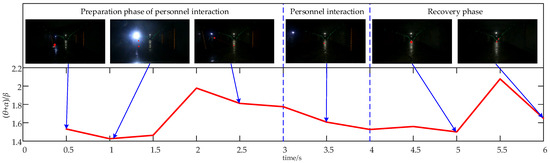 As illustrated in Figure 13, the average relative power combination value (θ + α)/β during the personnel interaction process ranges from 1.43 to 2.08, reflecting increased alertness. In the preparation phase, the driver initially focuses on individuals to the left of the tunnel, leading to a steady rise in alertness. Between 1 and 1.5 s, attention shifts upward due to stimuli from personnel headlamps, followed by alternating focus between the personnel and the forward driving direction during the next 1.5 s, which causes a slight dip in alertness. During the personnel interaction phase, alertness gradually increases with the ongoing interaction. In the recovery phase, as the vehicle returns to normal driving conditions, alertness decreases from 5 to 5.5 s but remains relatively high during other intervals.