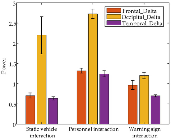 Non-parametric tests conducted on EEG data collected during the first second after interactions with static vehicles, personnel, and warning signs revealed significant differences, specifically frontal lobe δ band power (p = 0.0273 < 0.05), occipital lobe δ band power (p = 0.0273 < 0.05) and temporal lobe δ band power (p = 0.0273 < 0.05). Figure 17 presents error bar plots of the average EEG parameters of all subjects during the 1 s after interaction with different objects. The results indicate that δ band power is highest in the frontal, occipital, and temporal lobes after interactions with personnel. Conversely, δ band power is lowest in the frontal and temporal lobes after interactions with static vehicles and lowest in the occipital lobe after interactions with warning signs.