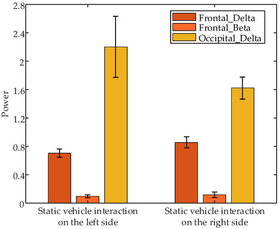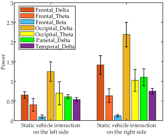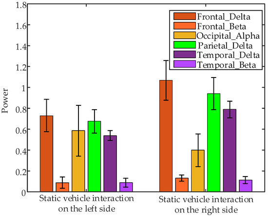 Non-parametric tests conducted on EEG data collected during the 1 s interaction at different positions revealed significant differences in the following EEG parameters: frontal δ band power (p = 0.0495 < 0.05), frontal θ band power (p = 0.0433 < 0.05), frontal β band power (p = 0.0045 < 0.05), occipital δ band power (p = 0.0495 < 0.05), occipital θ band power (p = 0.0433 < 0.05), parietal δ band power (p = 0.0495 < 0.05), and temporal δ band power (p = 0.0495 < 0.05) between interaction with static vehicle on the left and right sides. Figure 20 shows the error bar plots of the average EEG parameters of all subjects during the 1 s interaction at different positions. The results indicate that the power of significant EEG features during interactions with static vehicles on the right side is notably higher compared to those on the left side.