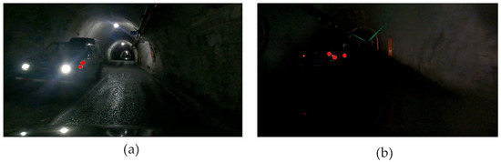Diagram of static vehicle interaction in different brightness. (a) Interaction with a dynamic vehicle in a bright environment; (b) interaction with a dynamic vehicle in a dark environment.