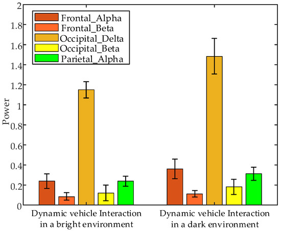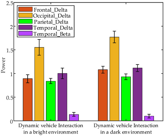 Non-parametric tests performed on EEG data from the 1 s before interaction under various brightness levels revealed significant differences in the following parameters: frontal α band power (p = 0.0374 < 0.05), frontal β band power (p = 0.0062 < 0.05), occipital δ band power (p = 0.0495 < 0.05), occipital β band power (p = 0.0069 < 0.05), and parietal α band power (p = 0.0250 < 0.05) between interaction with dynamic vehicle in bright and dark environments. The error bar plots of the average EEG parameters of all subjects during the 1 s before interaction under different brightness conditions are displayed in Figure 23. These results indicate that feature power values are significantly higher during interactions with a dynamic vehicle in dark environments compared to bright environments.