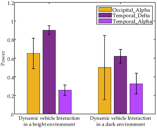Non-parametric tests on EEG data from the 1 s interaction under various brightness levels revealed significant differences in the following parameters: occipital α band power (p = 0.0374 < 0.05), temporal δ band power (p = 0.0495 < 0.05), and temporal α band power (p = 0.0163 < 0.05) between interaction with dynamic vehicles in bright and dark environments. Figure 24 shows the error bar plots of the average EEG parameters of all subjects during the 1 s interaction under different brightness conditions. The results indicate that occipital α band power and temporal δ band power are higher during interactions with dynamic vehicles in bright environments compared to dark environments, whereas temporal α band power is lower in bright environments.