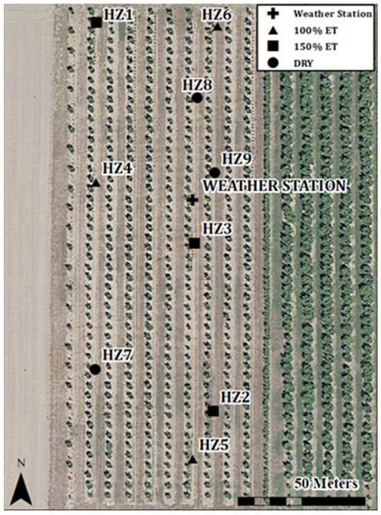 The experiment was conducted from 25 June 2021 to 14 September 2021 on a 1-hectare hazelnut orchard at Oregon State University (North Willamette Research and Extension Center, Aurora, OR. 45.278581, −122.755672). The orchard contained cv. ‘Jefferson’ hazelnuts [50] planted using 3 × 9 m spacing. The hazelnut trees were irrigated using pressure-compensated drip emitters (1.89 LPH flow rate; Netafim USA, Fresno, CA, USA) spaced 0.5 m away from either side of each trunk and attached to 12.7 mm diameter polyethylene tubing. Each row contained two separate polyethylene tubes, allowing irrigation to be independently controlled for individual trees within the row based on their assigned irrigation treatment group. Throughout the experiment, leaks in the irrigation system were checked daily by research assistants. Visual inspections were performed to identify any punctures, typically resulting from animal chewing. Fortunately, there were no leaks detected in the irrigation system during the experiment.