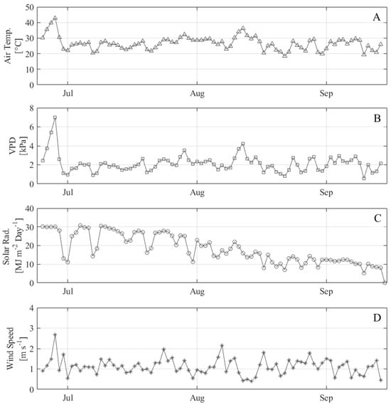 Daily average environmental data at NWREC site from field weather station including (A) air temperature, (B) vapor pressure deficit, (C) incoming solar radiation, and (D) wind speed.
