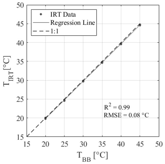 Example of low-cost IRT accuracy showing a linear regression between the IRT object temperature (TIRT) and the blackbody calibrator temperature (TBB) for IRT 5.