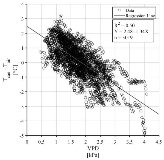 In this study, , , and are measured directly. Estimates for were obtained using energy balance principles and an empirical model. Idso et al. [7] introduced the non-water-stressed baseline (NWSB), which shows that in well-watered crops, the difference between canopy temperature and air temperature, also known as leaf temperature depression (LTD), is linearly related to the vapor pressure deficit (VPD) for a variety of crops (Equation (2)).