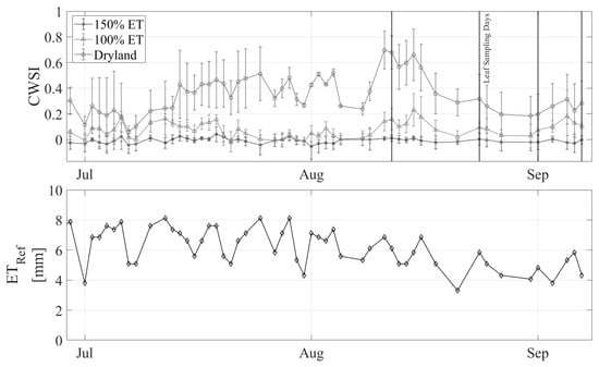 Top—CWSI over the growing season between the three treatments. Bottom—daily reference ET over the season. Vertical lines indicate the days on which SWP samples were taken.