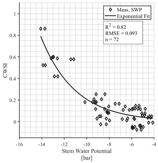 The daily CWSI was correlated with the stem water potential (SWP) measurements (Figure 7). SWP samples that were taken on days on which the environmental parameters were outside the bounds established for the NWSB were removed from this analysis, resulting in a final sample size of 72 leaves from four survey days (12 August, 24 August, 1 September, and 7 September). The exponential relationship between daily CWSI and SWP is significant (p < 0.001) with an R2 = 0.83.