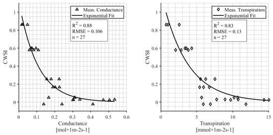 The relationship between the calculated CWSI and leaf conductance and leaf transpiration is shown in Figure 8. Only measurements from days with weather conditions that were within the bounds specified for the NWSB are included in the analysis, and therefore, the data shown in Figure 8 are from one survey on 12 August 2021. The exponential relationship between the daily CWSI and midday conductance is significant (p < 0.001) with an R2 = 0.88. The exponential relationship between the daily CWSI and leaf transpiration is significant (p = 0.004) with an R2 = 0.83.