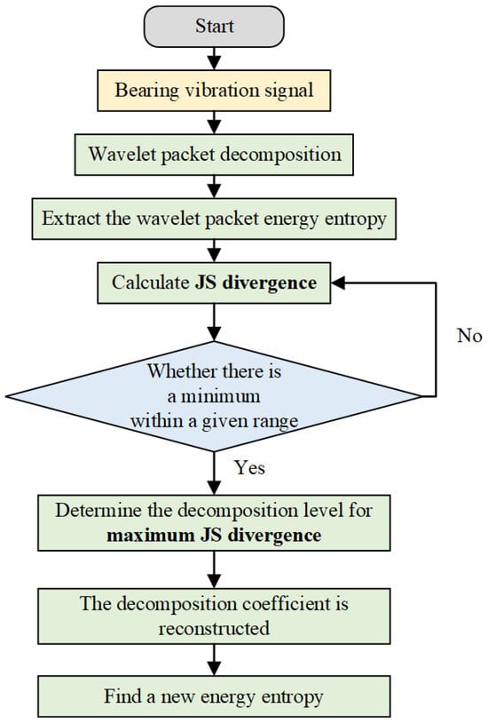 In order to improve the accuracy of degradation evaluation, JS divergence is introduced to improve the wavelet packet decomposition method. The specific process is shown in Figure 1. Firstly, the original vibration signal is decomposed by a wavelet packet in the range of the proposed decomposition level, and the JS divergence between the normal vibration data and the failure vibration data is calculated under each decomposition level. Then, the decomposition level with the largest difference is selected as the best level. Finally, the energy entropy feature is extracted under this optimal level. Doing so can more accurately distinguish between normal and invalid data, significantly enhancing the effectiveness of anomaly detection.