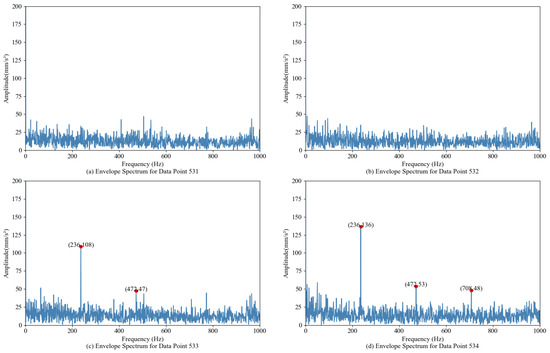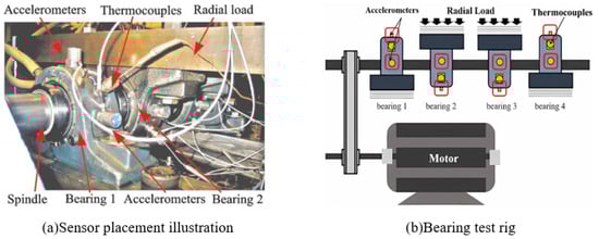The experimental data came from the NSFI/UCR Intelligent Maintenance System Center (IMS) of the United States [], and the experimental equipment is shown in Figure 4. The bearing speed was 2000 r/min, the experimental sampling frequency was 20.48 kHz, sampling interval was 10 min, and the theoretical fault frequency of the outer ring was 236 Hz. The specific experimental data are shown in Table 3.