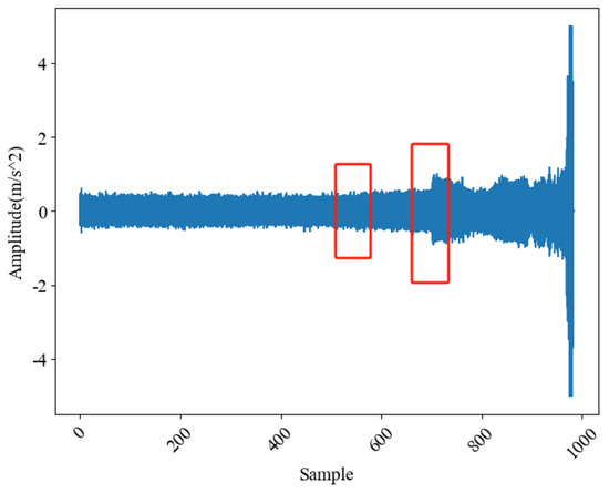 Taking IB2-1 as an example, the time domain waveform of its whole life cycle data is shown in Figure 5. Only a general trend can be seen from the figure, that is, the first 500 groups of data are very stable and in a healthy state, while the amplitude fluctuation of the 500th to 600th group increases (the first red box in the figure), and the fluctuation is particularly obvious when the data of the 700th group are around (the second red box in the figure), and approximately, the last 10 groups are close to failure.