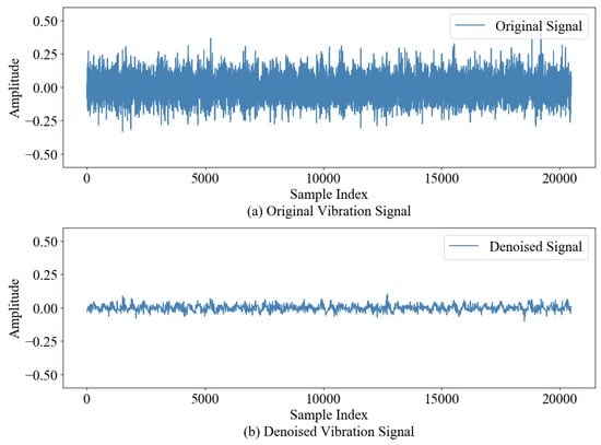 In order to better distinguish the feature difference between normal data and failure vibration data and improve the accuracy and reliability of degradation analysis, this paper adopted JS divergence to measure the difference degree. The results are shown in Figure 6, where the horizontal axis is the decomposition level, and the vertical axis is the JS divergence value between the energy entropy of normal data and the energy entropy of failure vibration data. The decomposition levels were set to range from 3 to 6, and the JS divergence can be calculated to be about 0.806, 0.810, 0.788 and 0.747, respectively. It can be seen that the decomposition difference is the largest when level = 4. According to the theory in Section 2.1, the decomposition level is 4 to effectively distinguish between normal vibration data and failure vibration data. Figure 7 shows the comparison of vibration signals before and after wavelet packet decomposition using the optimal decomposition level. Among them, Figure 7a is the original signal of the 7th group of data, and Figure 7b is its denoised vibration signal. It can be seen that the curve after decomposition by the above method is more stable than that before decomposition.