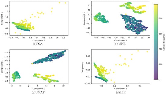 - Feature extraction and optimization. The features are extracted from the original vibration data and normalized, the original multi-domain feature set is established, and the optimal feature set is constructed through optimization; then, dimensionality reduction is carried out.