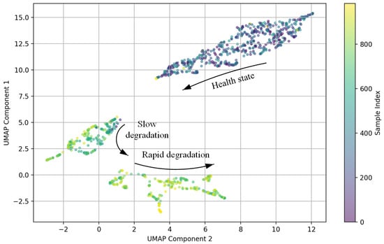 - Build the degraded model. Use UMAP dimensionality reduction algorithm to reduce the dimensionality of each line vector of the feature matrix, fuse the extracted features, and use the two-dimensional matrix after dimensionality reduction to train the GMM model and FCMD model. Input the test set into the two trained models for fusion to obtain fusion DI.