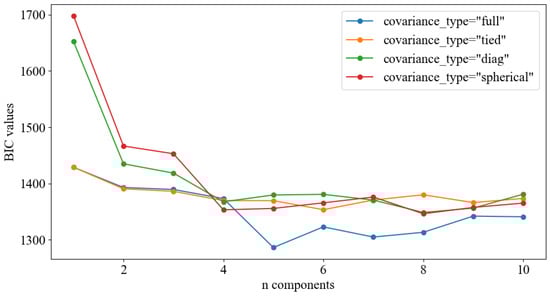 In particular, the mixed number (n components) needs to be defined in advance, so this paper adopted the Bayesian Information Criterion (BIC) [], and the optimal number of mixed models is the value when the BIC score is lowest. BIC pays more attention to punishing model complexity, and points with low BIC scores usually have good model complexity and data fit. BIC scores are defined as follows: