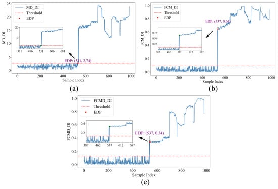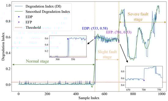 - DI gradient analysis []: The trend of DI is used to analyze the bearing degradation, as shown in Equation (23). When the gradient of DI (GDI) changes abruptly, it indicates that the bearing may be degraded or faulty.where x represents time, and represents the gradient of DI with respect to x. In order to identify the mutation point, this paper defines the threshold of “mutation point” as 0.05, and when GDI exceeds the threshold, it is considered that there is mutation at this point. To avoid misjudgment, if the threshold is exceeded three consecutive times, the first point is set as the start of the fault phase, marking it as the early failure point (EFP), and the horizontal line of this point is the “” value.