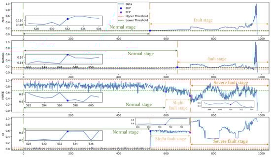 For mechanical parts, EDP identification and degradation trend tracking are key technologies in the life cycle performance degradation evaluation of mechanical equipment [], among which, the setting of threshold for early degradation detection and the selection of evaluation indicators for evaluation methods are particularly important.