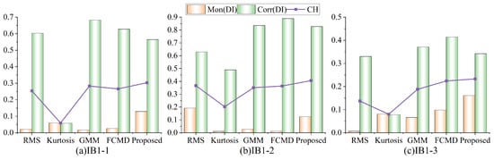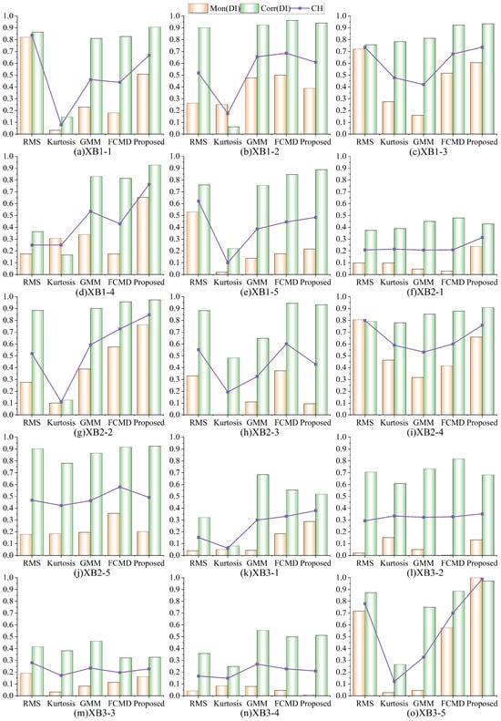 It can be seen that the proposed method ranks first in the CH score index for many times, that is, the best results are obtained in Figure 20c,d,f,g,k,l,o, which is superior to other methods. Compared with a single index, the comprehensive evaluation score is higher and the monotonicity trend is better. Therefore, the proposed method performs stably and maintains a leading position in multiple experiments, with wider applicability and effectiveness. In general, the proposed method performs well in all aspects. It is sensitive to initial degradation and can accurately detect EDP, and also, the DI shows good monotonicity and trend, performs better in the whole degradation trend, and has better performance compared with other methods.