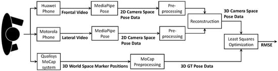 The subjects were recorded by the red–green–blue (RGB) cameras of two commercially available smartphones (Motorola moto e40, Huawei Mate 20) in portrait format ( pixels and at 30 frames per second (fps)). Each trial is captured as an individual recording. Since our previous research [24] found the angle between two cameras for 3D pose reconstruction to be optimal when it approaches 90°, the two smartphones were positioned frontal and lateral to the subjects. The phones were placed upon tripods at a height of approximately 130 cm and were positioned perpendicular to the ground.