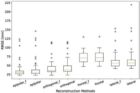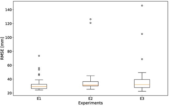 Figure 6 shows the RMSE for the unfiltered epipolar method, for all subjects over the different experiments. Each boxplot contains 27 videos. As can be seen, no significant difference between the median values can be observed for the three experiments (E1: 29.2 mm, E2: 31.2 mm, E3: 32.0 mm, p-values of 0.270 and 0.200 between E1/E2 and E1/E3, respectively), with E3 having a slightly increased interquartile range. Thus, we can confidently state that the exercise quality does not have an influence on our reconstruction accuracy.