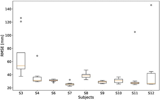 Figure 5 displays the RMSE for the unfiltered epipolar reconstruction method for each subject. Each individual boxplot contains nine videos, resulting in lower interquartile ranges. As can be seen, most subjects achieve a low RMSE (minimum median of 25.4 mm is achieved for subject 7), with the notable exception of subject 3, whose median RMSE value is as high as 53.6 mm.