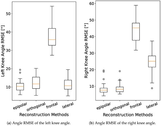 Figure 8a,b show the angle RMSE of the left and right knee angle, respectively. First of all, we notice the much higher RMSE for the 3D estimation based on the frontal camera. This is expected, since the angles are predominantly in the lateral plane. For the left side, we can see that the epipolar reconstruction achieves the lowest median of , with the 3D MediaPipe data from the lateral camera being a close second at and the orthogonal reconstruction achieving slightly worse results than both. For the right side, however, the epipolar RMSE achieves an even lower median of , while the lateral RMSE rises to . This can easily be explained by the right side of the subject being obstructed by the left from a lateral view. Similar results can be seen when looking at the hip angle. The differences between the epipolar and orthogonal reconstruction are not significant (p-value of 0.070 and 0.695 for the left and right knee, respectively). The differences between epipolar reconstruction and the lateral single-camera approach are not significant for the left knee (), but are significant for the right knee (). When looking at the literature, Hancock et al. [34] have compared different goniometry methods used to measure knee angles. They found the digital inclinometer to be the most accurate method of assessment (6° minimum significant difference). The long arm goniometer had a minimum significant difference of 10°, while visual estimation and short arm goniometry were found to be equally inaccurate with 14° minimum significant difference. All of these measurements were made with a subject laying still on an operating table. In comparison, we can see that for our method, we can achieve comparable results with even though the subject was in motion.