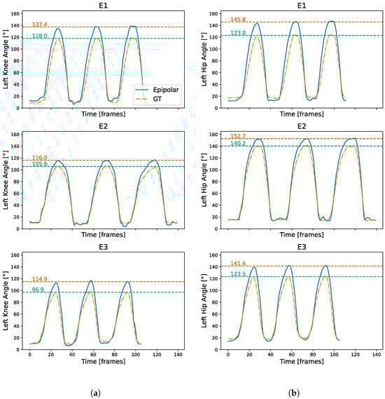 Figure 9 shows the absolute angle of the left knee and hip of subject 7 for the epipolar reconstruction and the GT. More specifically, Figure 9a shows the left knee angle of the first three repetitions of E1 (top), E2 (middle) and E3 (bottom), while Figure 9b shows the left for the three experiments. As can be seen, the reconstructed pose angle shows the same trends in the signal curve as the GT. The absolute error between the two curves is the highest when the angles reach their peak values, with the epipolar reconstruction consistently overestimating the maximum angle. However, despite these shortcomings of the reconstruction, we can still distinguish the three experiments from the mean peak values obtained from the epipolar reconstruction alone. The left knee angle can be used to separate the correct execution in E1 from the other two experiments, with a mean value of 137.4°, which is about 20° higher than the mean peak values for E2 and E3. Similarly, the left hip angle can be used to separate E3 from E2, with a mean peak value of 141.4°, which is more than 10° lower than the mean peak value for E2. These differences are very comparable to the values obtained from the GT.