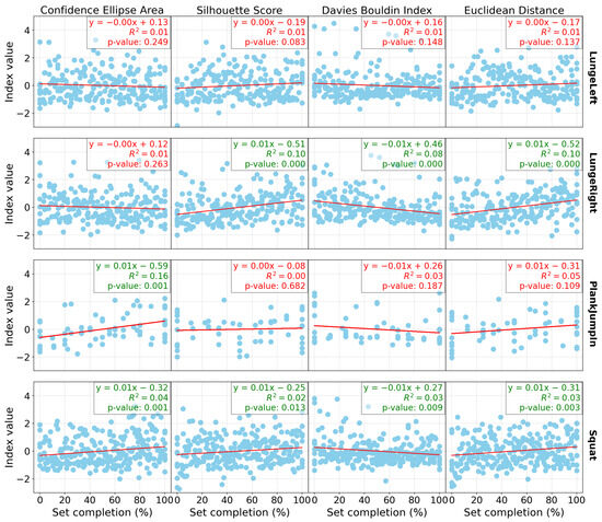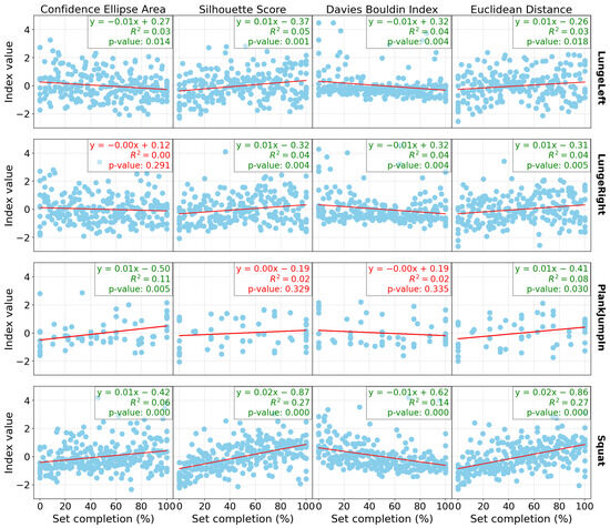 Linear regression outcomes for computed indices by exercise, with each column representing an index and each row representing a different exercise for DB4 (3 IMUs on the hip and forearms). Each graph displays the linear coefficient, R², and p-value for the corresponding regression, with values in green indicating statistical significance (p < 0.05) and values in red indicating non-significance.