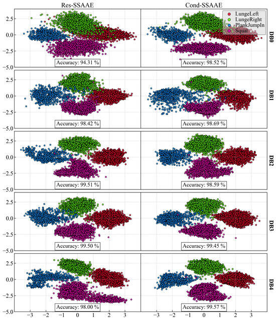 Figure 4 presents the latent space obtained for each database and model for K = 0. The latent space accuracy on the test set for Res-SSAAE is 94.31, 98,42, 99.51, 99.50, and 98.00% for DB0, DB1, DB2, DB3, and DB4, respectively. For Cond-SSAAE, the latent space accuracy is 98.52, 98.69, 98.59, 99.45, and 99.57% for DB0, DB1, DB2, DB3, and DB4, respectively.