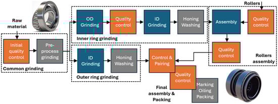 Figure 1 shows the main elements of the production line at Fersa Bearings. It has two main process flows, corresponding with the outer and the inner rings. In both cases, the grinding process is followed by honing, washing, and quality control. After the quality control of the inner ring, the rollers are assembled and the quality of the subset is evaluated. Following that, this subset is assembled with the outer ring by pairing the parts according to their dimensions for fulfilling the highly restricted tolerances of the final product. The last processes of the final assembly are marking, oiling, and packing.