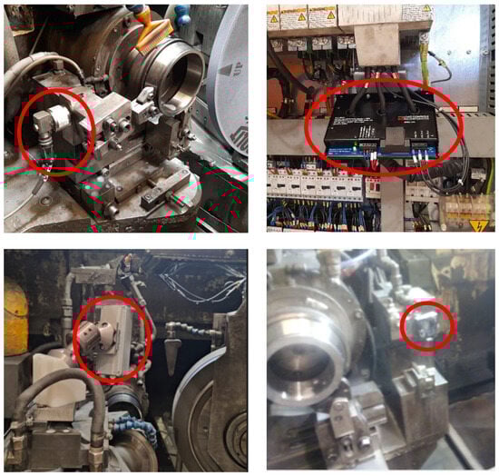 Several sensors (Figure 3) have been installed in the line for improving the capability of the system for predicting quality defects (waviness and burns) and the status of the tool. Waviness is related with the undulations per revolution (UPR) which characterizes the roundness profile of the bearing surface and it is affected by various types of vibrations [24], like imbalances in the rotating elements (grinding wheel, dressing actuator, workpiece) or external sources. In order to predict the risk of waviness in real time, ICP accelerometers have been installed near the rotary elements.