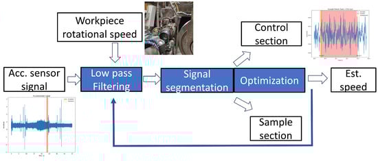 The waviness algorithm predicts the appearance of this failure in the current workpiece by using the information from the accelerometers near the machined part. This prediction is performed in two phases: firstly, the turning speed of the part is estimated; and, secondly, the presence of waviness is evaluated. The estimation of the turning speed is necessary due to the slippage of the workpiece on the magnetic clamp, resulting in a discrepancy between the commanded velocity and the actual one. To fix this error, the algorithm in Figure 5 is used for estimating the real speed (rad/s). First of all, the accelerometer signal is divided into sections, each corresponding to one wheel revolution. After that, the algorithm compares a control section that represents the most recent revolution with a sample section from the previous revolutions. The estimation of the speed is obtained by maximizing the correlation between both sections.