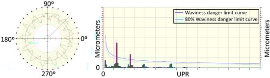 Post-manufacturing quality process result for waviness analysis. Purple line shows the threshold harmonic content for the waviness appearance. Light blue line shows 80% probability threshold for waviness appearance.
