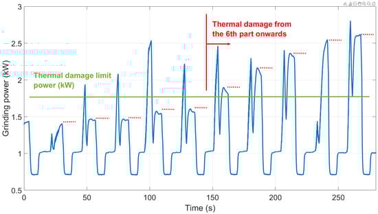 With regard to the thermal damage, the presented algorithm has been tested in different conditions until exceeding the power limits for the appearance of burns. This can be seen in Figure 14, where the conditions were modified with the logical change in the power threshold (blue line). During the first run, the thermal damage starts appearing in the ninth part after dressing. After that, the decrease in the workpiece speed causes a reduction in the power limits, and the thermal damage is already present in the first part. Using an intermediate workpiece speed and following the same procedure, results show that the thermal damage appears in the second or third part. This influence of the workpiece speed was already analyzed in previous research [28], but under controlled conditions in a lab environment. In this case, the prediction model is able to accurately predict the thermal behavior under industrial conditions with slight differences coming from changes in process parameters. It was observed in every case that, once the power exceeded the predicted limit in each series, the workpieces exhibited thermal damage when tested in the laboratory thereby validating the predictive model for different grinding conditions.