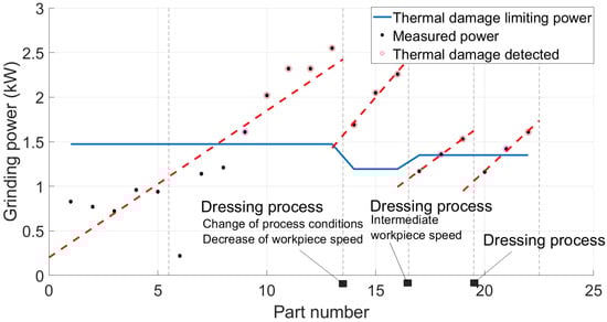 Once the power limit calculations are developed, the solution of the predictive model relies on comparing the consumed power with the calculated limit. If the grinding power exceeds it on a particular workpiece, there is a risk of thermal damage occurrence. Figure 8 shows a schematic example of the power evolution of different workpieces over time. The red dots are the sampled measurements from the complete measured power signal (blue line). These values are then compared with the power limit (green line). In the case described in the figure, thermal damage would occur after the sixth piece.