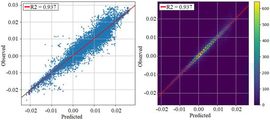 Values predicted by the dimensional line model versus actual values measured on the control machine. Scatter plot (left); 2D histogram (right).