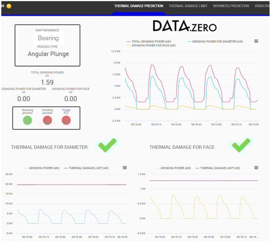 The information from the different sensors at the grinding machines is transmitted to the Danobat box system, which is used for data collection, analytics, and communication. Its compatibility with different communication protocols simplifies the integration with the different components. It connects the Danobat Cloud with the CNC (Computer Numerical Control) local machine and the process databases. The communication protocol from the new sensors to the Danobat box depends on the information source. OPC-UA is used for coolant concentration acquisition, while MODBUS is used for pre-processed data from accelerometers (10 kHz) and power meters coming from the installed PAC system (Programmable Automation Controller) INGESYS IC3. The high rate information from the AE sensor is acquired by a STEMlab system at 1 MHz and processed in a separate unit connected to the Danobat box using Ethernet. This is also the case for the analysis of the information from the thermal camera, which is connected via USB to a controller, which afterwards sends the information to the Danobat box using Ethernet. The CNC parameters of the grinding machines are collected using specific libraries developed in C# that allow access to the data via the machine manufacturer’s .DLL files.