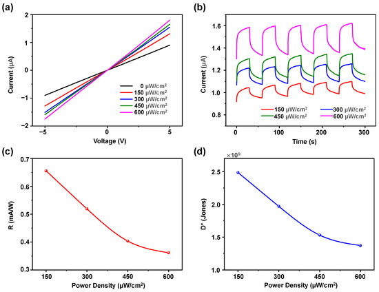 (a) I–V characteristics under varying UV light intensities. (b) Transient response curves under varying UV light intensities. (c) Responsivity (R) and (d) detectivity (D*) with a bias of +5 V under varying UV light power densities.