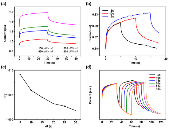By varying the time interval (Δt) between two UV light stimuli, the device exhibits a paired-pulse facilitation (PPF) effect. This effect is considered one of the most fundamental characteristics in biological synaptic information processing and is crucial for real-time information decoding and transmission. Typically, PPF manifests when two stimuli are applied in quick succession to a presynaptic neuron, resulting in the postsynaptic current from the second stimulus that is greater than that from the first stimulus [43]. This phenomenon is generally attributed to the different rate of neurotransmitter release triggered by the stimuli. Due to the short interval between the two stimuli, the rate of neurotransmitter release triggered by the first stimulus has not fully recovered, thereby resulting in a stronger response to the second stimulus. Figure 3c,d illustrate the PPF effect demonstrated by the device under two brief UV light stimuli. In the experiment, the Δt between two UV light stimuli was set to 5 s, 10 s, 15 s, 20 s, 25 s, and 30 s, respectively. The postsynaptic currents induced by the first and second stimuli are defined as A1 and A2, respectively, with the PPF index defined as PPF = (A2/A1) × 100%. As shown in Figure 3c, the PPF decreases as Δt increases, while Figure 3d exhibits the current–time (I–t) curves corresponding to each Δt. The results indicate that the postsynaptic current from the second stimulus is generally larger than that from the first stimulus, with the increment in the second postsynaptic current decreasing as Δt increases. Consequently, the PPF gradually diminishes with increasing Δt. Analogous to biological synapses, when the first UV light stimulus induces an EPSC in the device, a subsequent UV light stimulus applied within a short interval results in a larger EPSC due to insufficient recovery time under dark field conditions. As Δt increases, the degree of current recovery also increases, leading to a decrease in the EPSC induced by the second stimulus. The results indicate that the device exhibits a good PPF effect that decreases with increasing Δt, which are similar to the properties of biological synapses. The device has significant potential for effectively mimicking biological synaptic behavior.