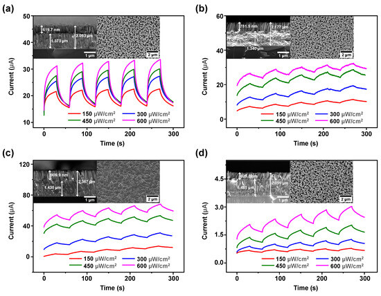 Figure 2a illustrates the current–voltage (I–V) characteristics of the device within a voltage sweep range of −5 V to +5 V under dark field conditions and varying UV light intensities. Under dark field conditions, the device exhibits minimal current. When exposed to UV light illumination, the current increased with the UV light intensity. This phenomenon occurs due to the increased number of photogenerated carriers (electron-hole pairs) in ZnO with higher UV light intensities, thereby enhancing the conductivity of the device.
