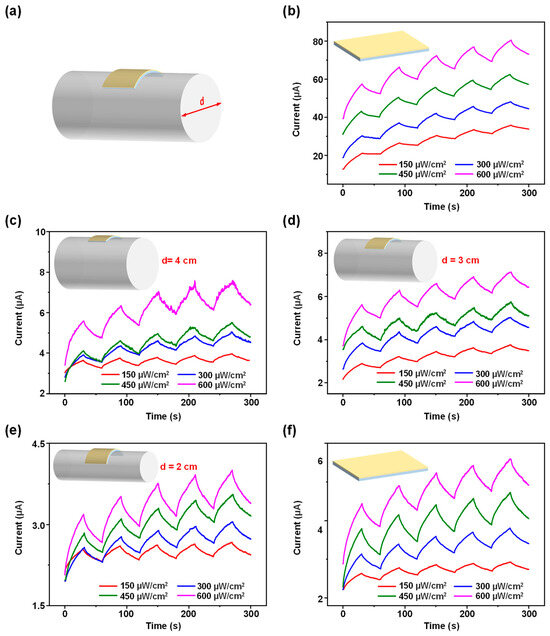 (a) Schematic diagram of the bending experiment. Transient response curves under varying UV light intensities for the device with the nanowire growth solution concentration of 100 mmol/L in various bending states. (b) Initial state. (c) Cylinder rod diameter d = 4 cm. (d) Cylinder rod diameter d = 3 cm. (e) Cylinder rod diameter d = 2 cm. (f) Recovery to the initial state after bending.